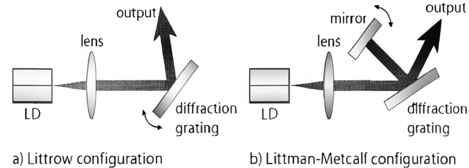 Các laser trong khoang chính có khoang ngắn như DFB và DBR có thời gian tương tác photon trong khoang chính bị hạn chế, khiến cho việc nén băng thông sâu trở nên khó khăn. Để nén thêm băng thông đường truyền và triệt tiêu nhiễu, các cấu hình khoang chính khoang ngắn như vậy thường được kết hợp với các cấu trúc khoang bên ngoài để tối ưu hóa hiệu suất. Các cấu trúc khoang bên ngoài phổ biến bao gồm các khoang bên ngoài không gian, các khoang bên ngoài sợi và các khoang bên ngoài ống dẫn sóng. Trước sự phát triển của các thiết bị sợi quang và cấu trúc ống dẫn sóng, các khoang bên ngoài chủ yếu bao gồm quang học không gian kết hợp với các thành phần quang học rời rạc. Trong số này, các cấu trúc phản hồi khoang bên ngoài không gian dựa trên cách tử chủ yếu áp dụng thiết kế Littrow và Littman, thường bao gồm khoang khuếch đại laser, thấu kính ghép và cách tử nhiễu xạ. Cách tử, đóng vai trò là phần tử phản hồi, cho phép điều chỉnh bước sóng, chọn chế độ và nén băng thông.